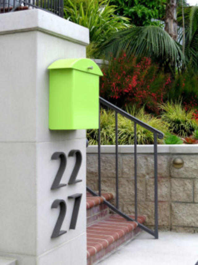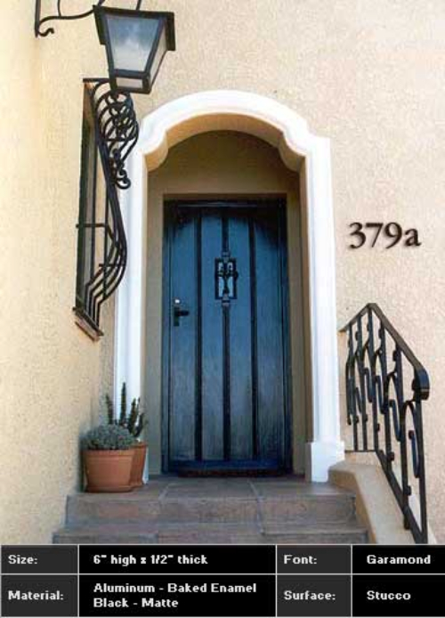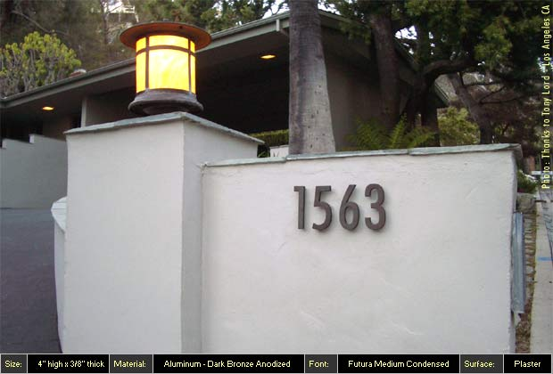 Our WaterJet Cut Aluminum Address Numbers are made using a fine, high pressure stream of water that carries an abrasive mineral. This allows for the cutting of sharp inside corners and intricate detail.The range of finishes available include 2 Clear PowderCoated, 10 Anodized and 10 baked enamel paint options (11 if you count the custom option wherein you provide us with the paint manufacturer, colour name & number & for a $20 charge we mix a match for you). The accuracy of the finish depictions on this page will vary depending on your browser, operating system, monitor calibration & more.Our customers most often choose aluminum when they need numbers for a high traffic area and need an extra degree of impact resistance. Second, for those that want the appearance and advantages of anodizing (various colours available, & the finish is coastal & winter roadside salt-mist friendly), the process is only available for aluminum . If it's the "silver metal" look you want (like the number 2 on the left) - go for Clear Anodized. To emulate "oil rubbed bronze" choose Dark Bronze Anodized.Send us a quote request - using the (ballpark) Price Calculator on this page -- and we'll send you a dimensioned drawing and a price quote with shipping included. If you have any additional comments, questions or requests, enter them in the "Comments..." text area of the form. For instance if there's a font you're interested in, a bigger size you want (we can quote CUSTOM CAST aluminum numbers or letters up to 36” tall and 3” thick, so you can inquire about that in the form on the left – they will soon have their own product page) or a material you've seen in our gallery (below) but can't find it listed here, let us know.All orders come with installation hardware (3/16” diameter threaded studs with spacer tubes to float the numbers out 1/2” from the wall – shorter & longer lengths also available) and a full scale drilling template for secure blind¹ fastening.1 no screws or hardware visible on the front or edges